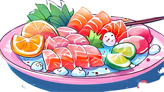 A delicious assorted sushi set with salmon, tuna nigiri, and maki rolls on a wooden plate with wasabi. Isolated on Transparent Background, PNG