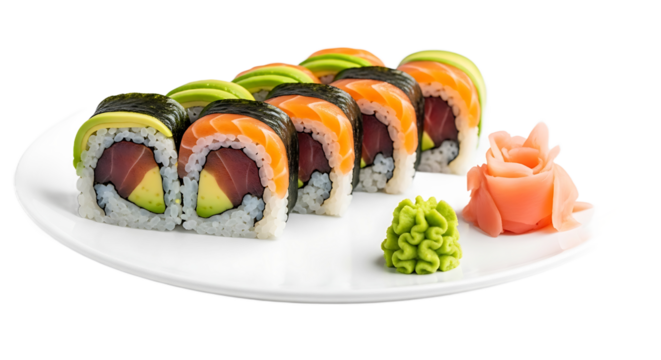Assorted fresh sushi rolls with salmon, tuna, and avocado, served on a white plate with wasabi and pickled ginger.