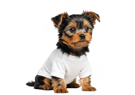 Yorkie puppy wearing white t shirt isolated on transparent background