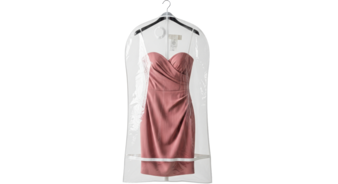 Isolated soft-pink dress in clear garment bag hanging on a hanger, for bridal party, prom, or gala