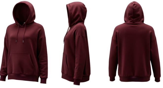 A maroon hoodie displayed from three angles, showcasing its design and fit against a neutral background