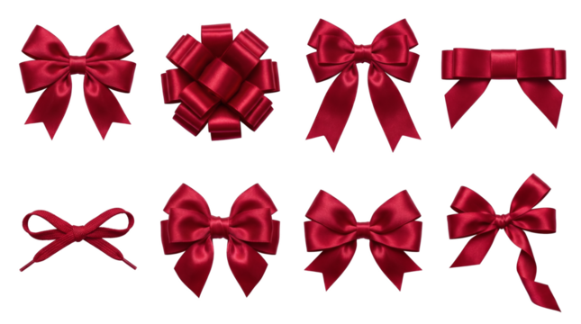 Red satin bow set including various tied styles, gift ribbon, pom pom, and shoelace knots isolated. Decorative elements for celebration and holiday gift wrapping.