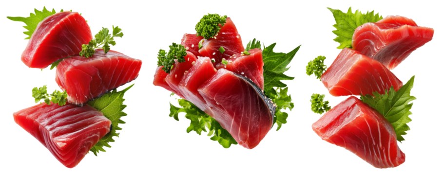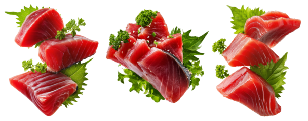 Slices of raw tuna sashimi with green shiso leaves and parsley garnish isolated on white background, Japanese cuisine freshness