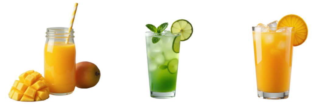 Set of refreshing beverages showcasing vibrant colors, tropical flavors, and delightful garnishments