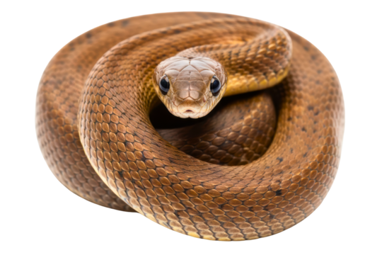 Coiled brown garden snake looking directly at the camera isolated on a transparent background