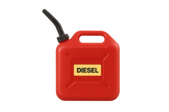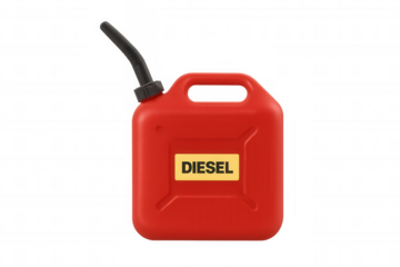 Red diesel fuel jerry can with pouring spout, carrying flammable liquid, transparent background