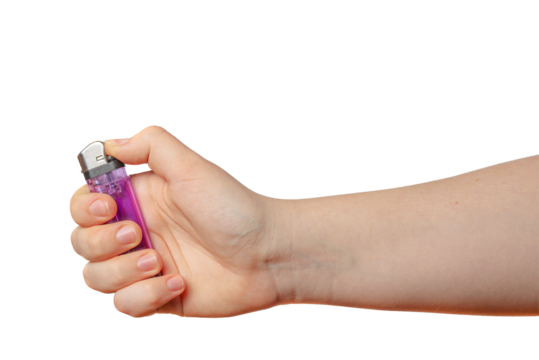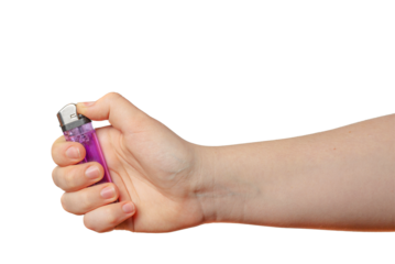 Child hand holding a small lighter close-up on a transparent background.