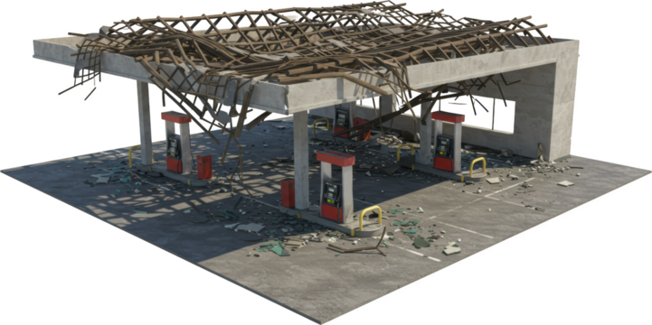 Destroyed Gas Station Canopy Collapsed After Disaster Scene