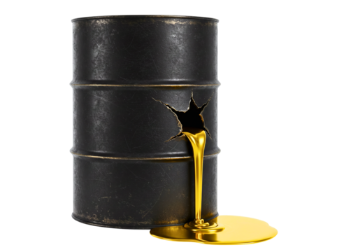 Black metal barrel with yellow liquid spilling out isolated on transparent background