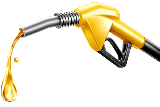 Yellow fuel nozzle dispensing golden liquid isolated on a transparent background