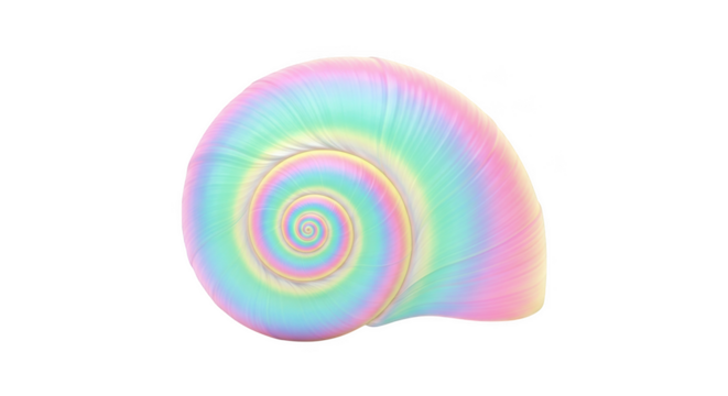 Pastel rainbow spiral seashell with textured surface isolated on a transparent background iridescent