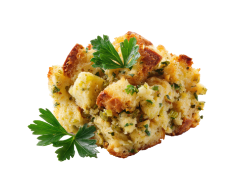 Savory bread stuffing with fresh herbs for festive occasions on a transparent background, cut out