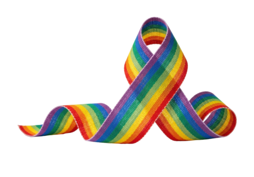A vibrant rainbow cotton gauze ribbon, loosely looped with unfurling ends, isolated on a transparent background with copy space, showcasing intricate detail and soft texture. Concept of joyful