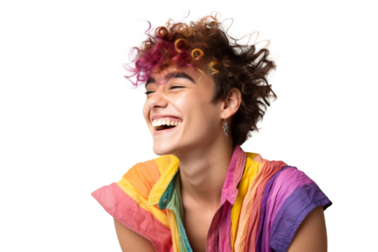 Young queer man in a colorful shirt laughing joyfully Isolated on white background