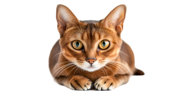Cute abyssinian cat lying down and gazing forward, showcasing its adorable features on a transparent background