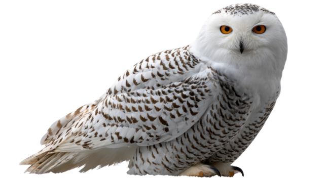 Majestic Snowy Owl: A regal snowy owl with piercing orange eyes and pristine white plumage perched, exudes an aura of serenity and wisdom, its gaze is focused, portraying the elegance of the wild.
