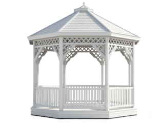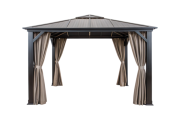 Wooden gazebo with white curtains and bench white gazebo with curtains isolated on a transparent background