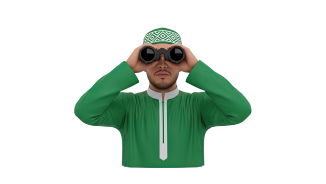 Man in Traditional Green Robe and Keffiyeh Holding Binoculars