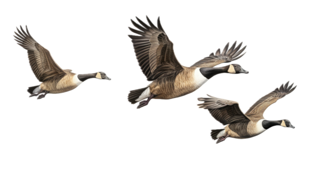 three Canadian Geese flying, 3/4 view, in a PNG, Nature-themed, isolated, and transparent Photorealistic illustration. Generative ai