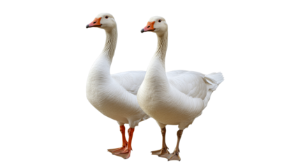 Pair of white geese flying together mid-air, wings fully spread, showing natural motion, transparent background