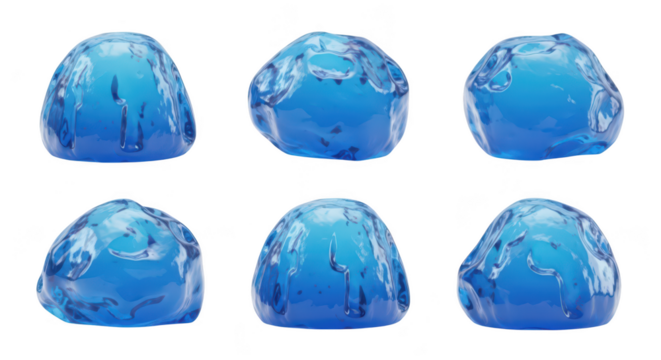 Six abstract blue gelatinous forms in various perspectives against a white backdrop for conceptual or visual art use