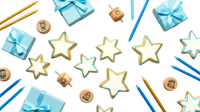 Hanukkah star cookies, dreidels, candles, and gifts are beautifully arranged for a festive and traditional Jewish holiday celebration.