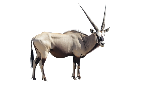 Gemsbok oryx antelope with long straight horns standing in a full body portrait isolated PNG with Transparent Background