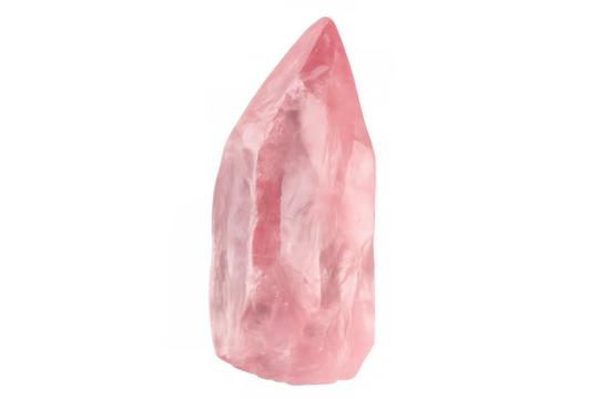 Polished rose quartz crystal point displaying sharp geometric facets, gleaming against pristine transparent backdrop