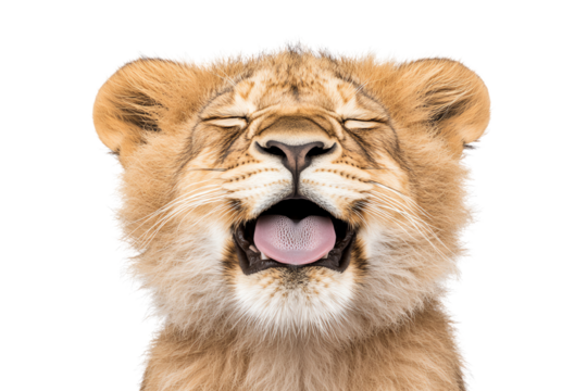A playful lion cub with its mouth open, showcasing its playful nature against a white isolated background.