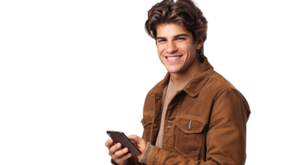 Smiling young man using smartphone on transparent background
