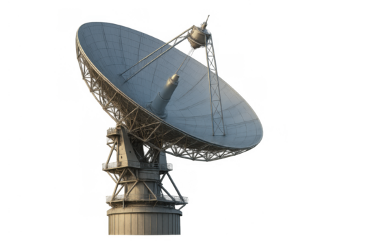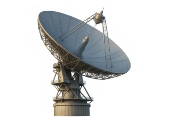 Radio telescope observing deep space, receiving satellite communication signals, transparent background