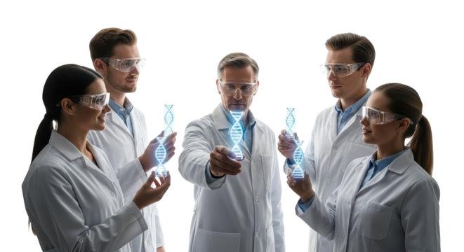 Medical research team dna analysis genetics science laboratory scientists innovation healthcare technology on transparent background