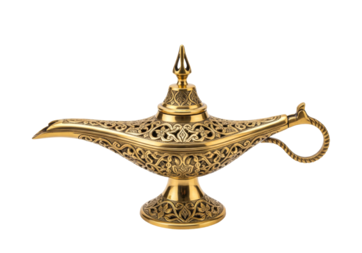 An ornate, golden genie lamp with intricate carvings stands against a stark black background. The lamp evokes tales of magic and wishes.