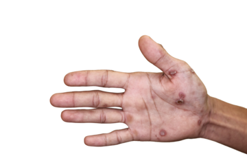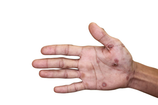 Close up of Secondary stage syphilis sores (lesions) on the palms of the hand. Referred to as "palmar lesions" PNG.