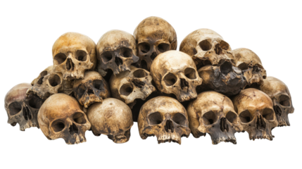 Mega set of piles of human skulls stacked. Isolated transparent PNG background. archaeology site cemetery, burial ground, gravesite, graveyard. Pile of human skeletons. Famine and drought. Horror