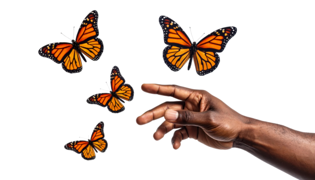 Dark-skinned hand reaching out towards a group of vibrant orange and black butterflies flying