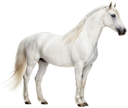 Majestic, powerful white horse with a flowing mane and tail, depicted in a realistic style, standing in a relaxed pose with a gentle gaze, illuminated by soft,, isolated on transparent background.