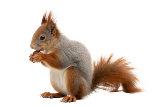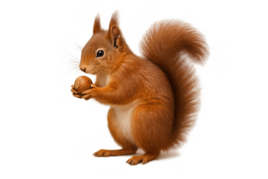 Red squirrel sciurus vulgaris holding a hazelnut, wildlife animal collecting food, transparent background