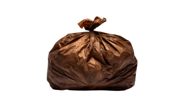 A tied-off, dark brown, plastic trash bag is centrally placed against a black backdrop