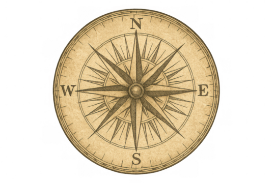 Vintage nautical compass rose printed on weathered parchment, symbolizing maritime exploration and directional guidance