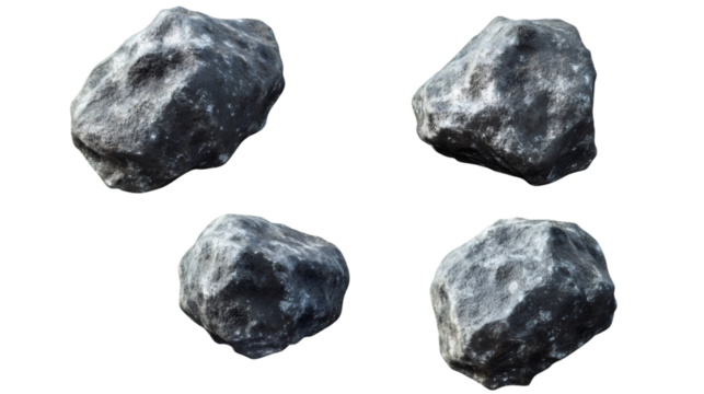 3D rendering of four gray rocks floating on a transparent background, perfect for compositing and photo manipulations