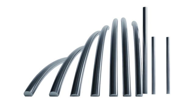 Metallic rods morph from curves to straight, varying heights, dark background
