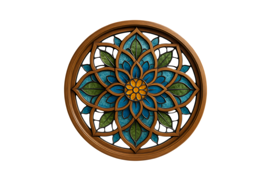 Decorative Mandala Window Art with Floral Pattern and Wooden Frame Isolated on a Transparent Background