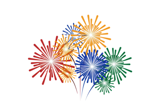 stylized geometric vector fireworks (starbursts, circles) in saturated red, yellow, blue, and green, clustered on a transparent background with maximum copy space. concept for commercial graphic asset