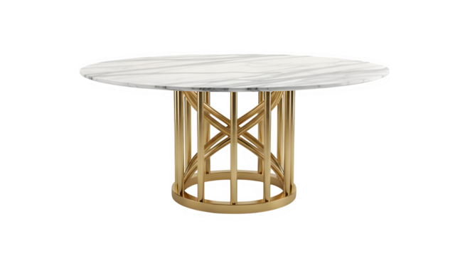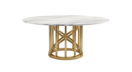 Round marble dining table with golden metal base isolated on transparent background furniture design