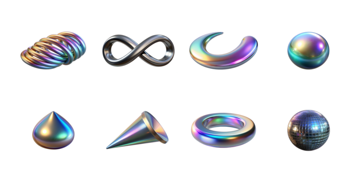 Collection of iridescent metallic 3d geometric shapes including an infinity symbol and abstract elements on transparent background