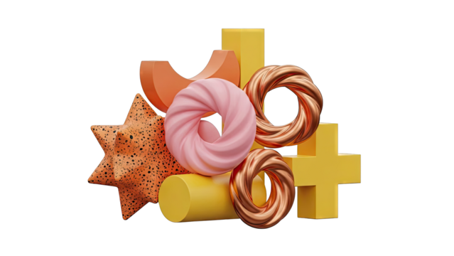 Transparent geometric playful abstract shapes red starburst yellow cross