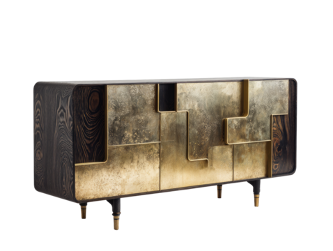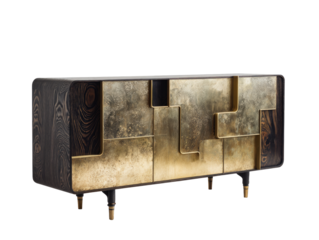 Dark wood and gold-toned cabinet with geometric panels