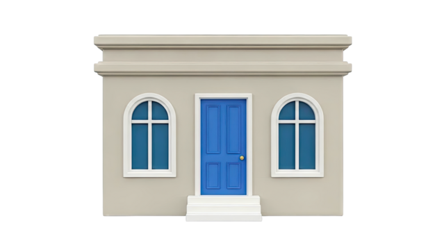 Stylized Building Facade with Blue Door and Arched Windows