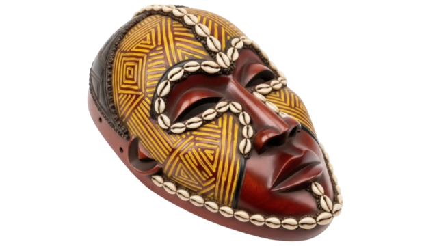 Isolated tribal face mask with geometric pattern and cowrie shell decoration, artwork